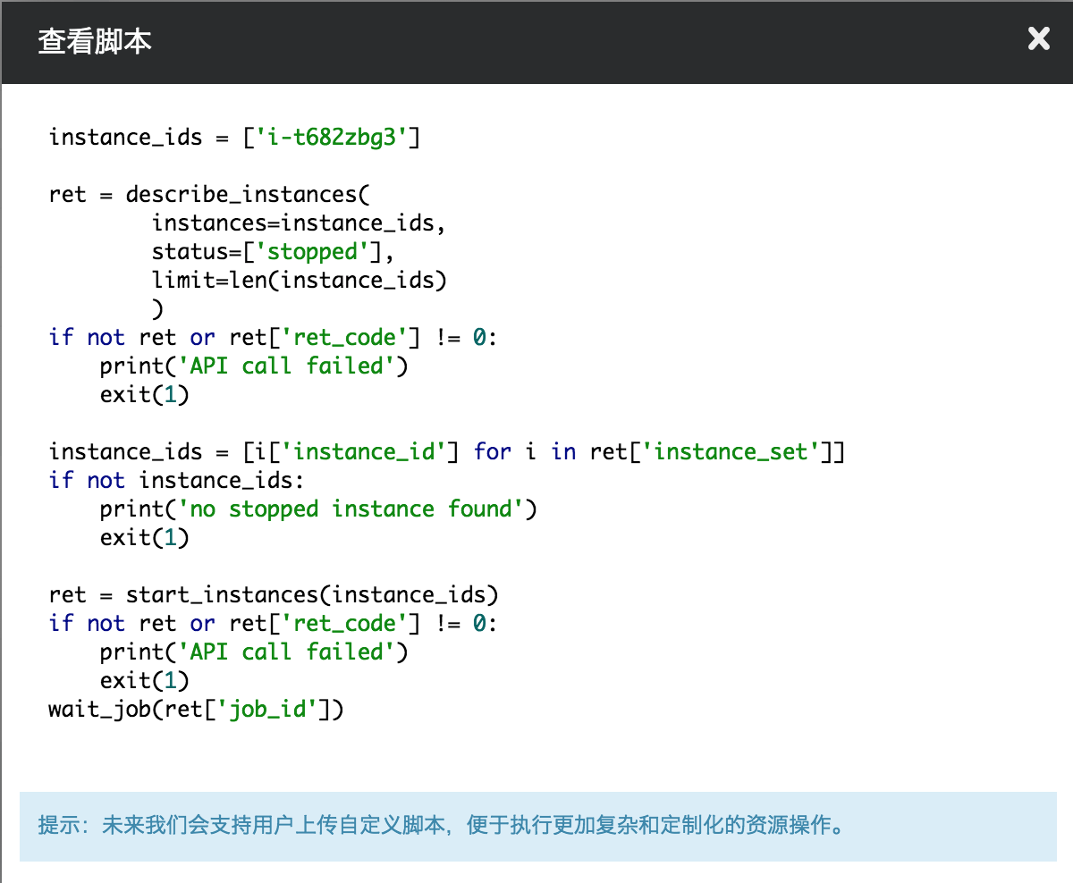 定时器任务设定后,会生成为类 python 的脚本,操作时会编译并执行这个脚本。 在控制台通过点击任务列表中『脚本』栏下面的『查看』可以浏览这个脚本。