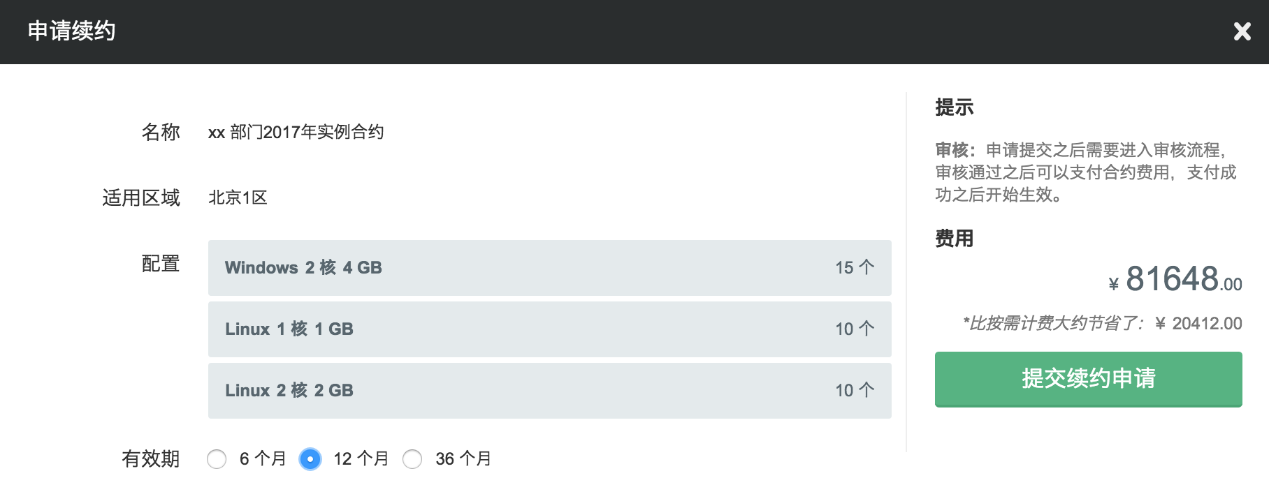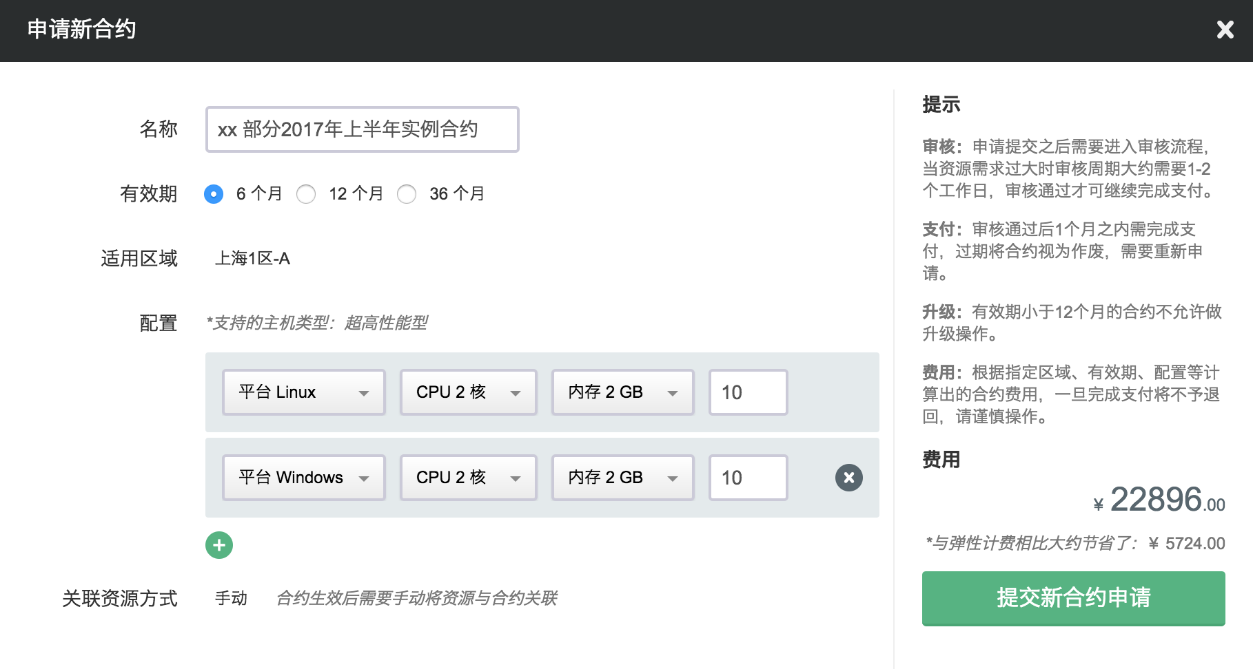 合约名称 用户可以根据自己的规划来标注命名合约,比如:xx公司xx部门2017年第一季度预留资源合约。且可以随时对名称进行修改。