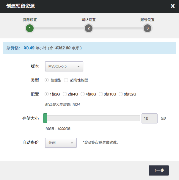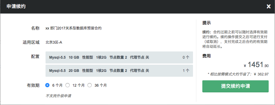 凡是通过了个人或企业认证的用户均可申请预留资源合约,申请时需要指定合约名称、有效期、关系型数据库配置等。