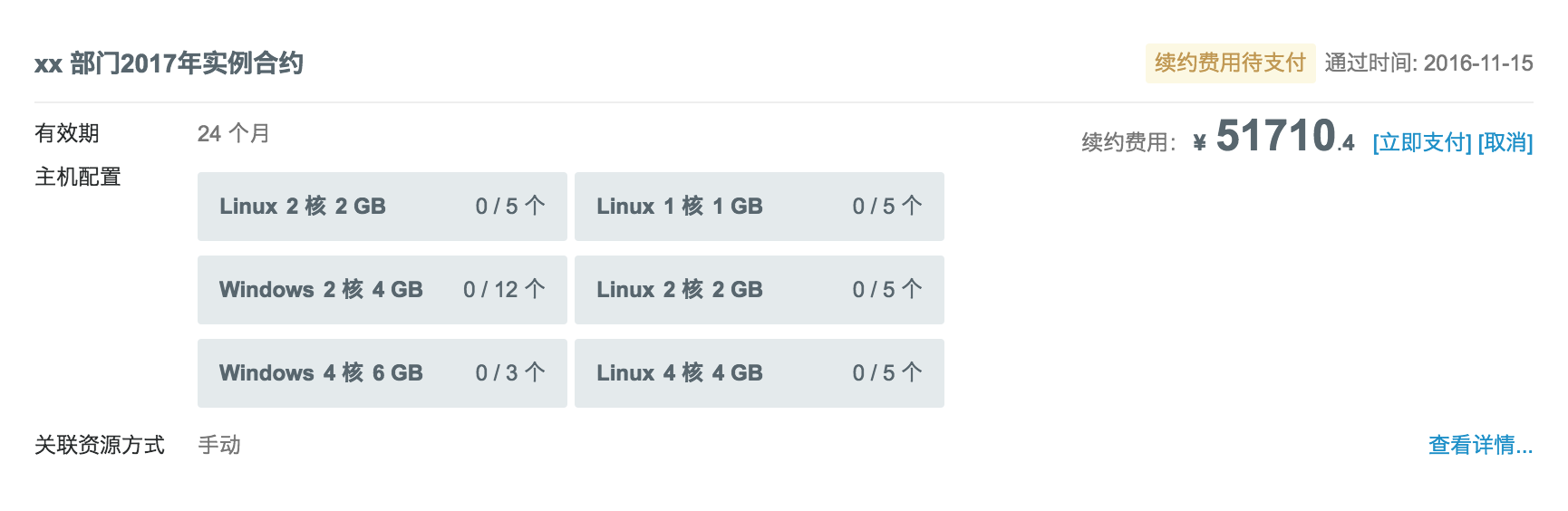 资源关联方式 目前支持“手动关联”:用户在合约详情页面可以选择相应资源与合约进行关联,未来会考虑增加支持“自动关联”方式。