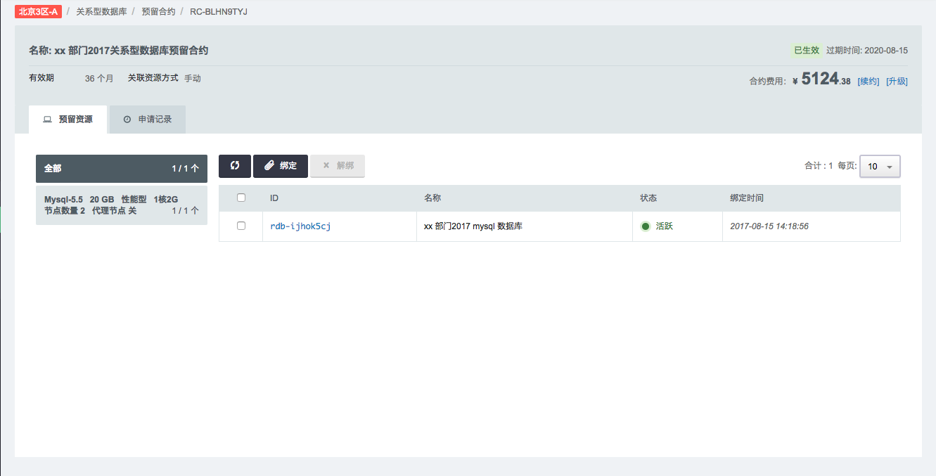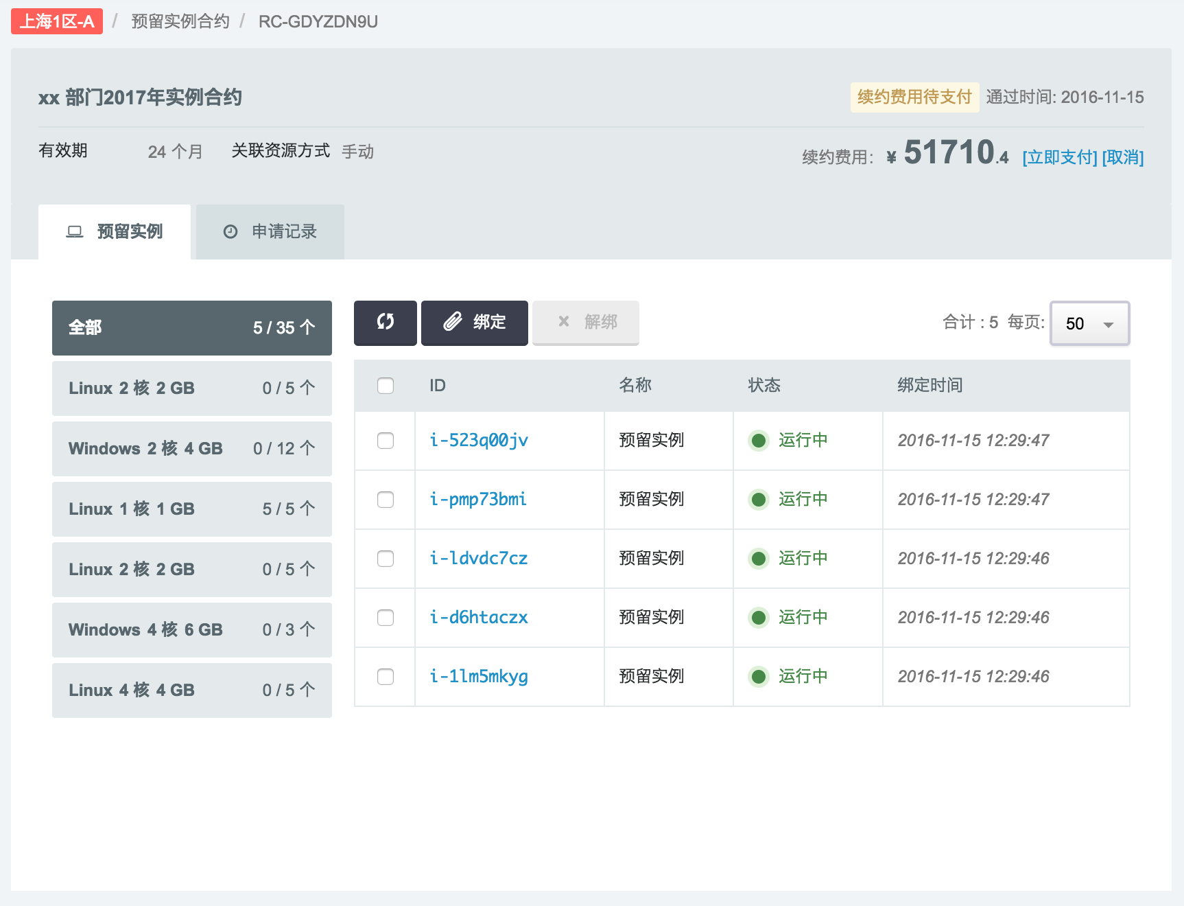 与合约关联的实例被称为“预留资源”。合约生效期间用户可以手动将符合实例配置条件的资源进行绑定或解绑的操作。