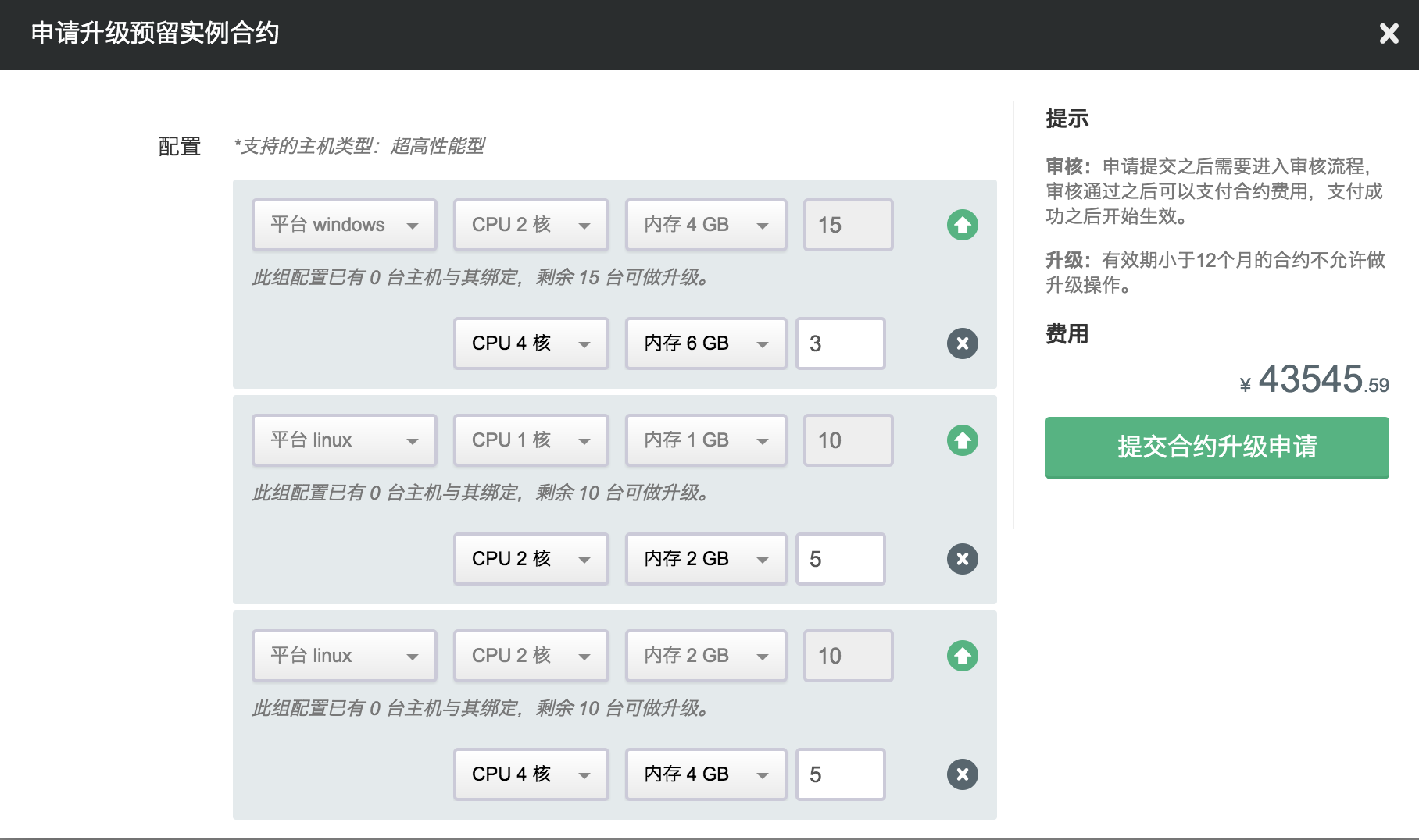 实例配置 每份合约中可以指定1组或多组实例配置,配置中包括实例的平台、CPU 核数、内存大小、类型和数量。