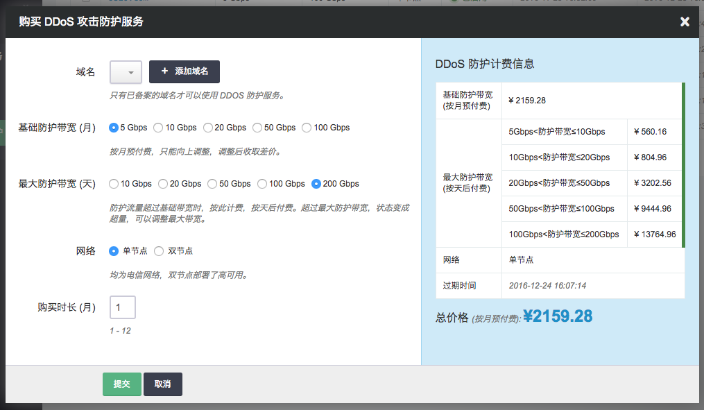 请根据需要选择合适的基础防护带宽和最大防护带宽,DDoS 攻击防护服务收费规则如下: