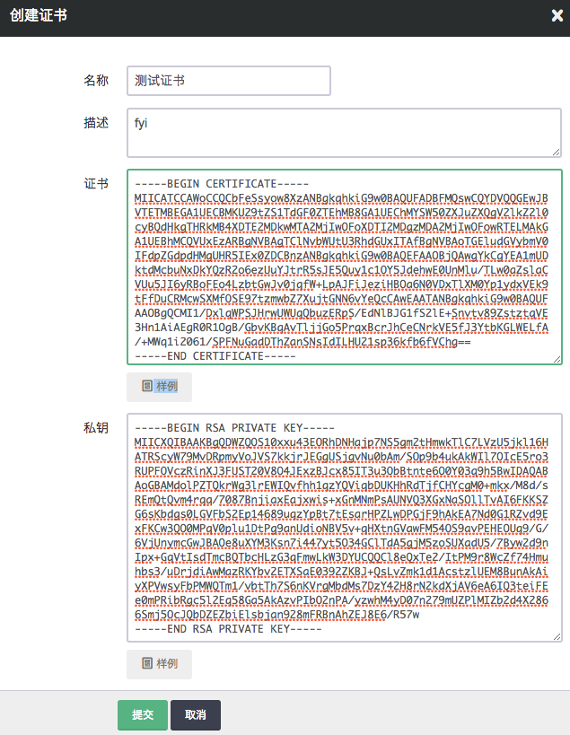 如需开启 HTTPS 则点击 “开启 HTTPS 服务”,在证书列表选择一个要使用的证书, 点击创建证书可上传自己网站的证书和秘钥。