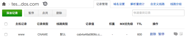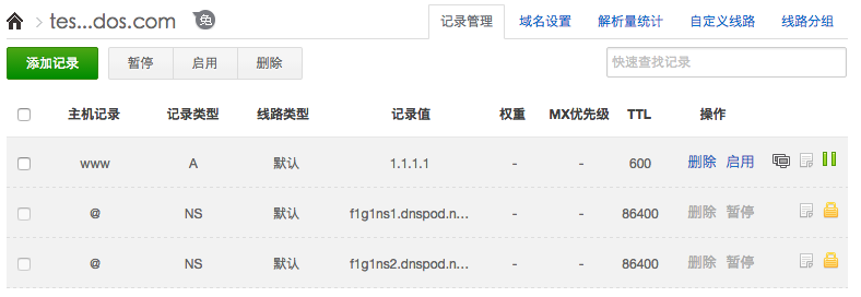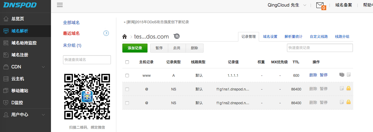 登录 DNSPod,可查看到原来的域名记录,www 记录已在添加到青云中,因此删除(或暂停)www 的 A 记录。