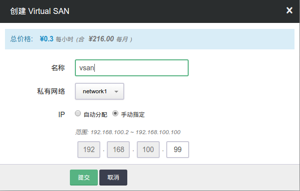 在创建的对话框中,你可以给 Virtual SAN 命名,并且配置它的网络。你需要将 Virtual SAN 放入一个受管私有网络中,并且可以指定 Virtual SAN 在私有网络中的IP。