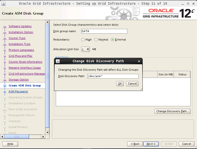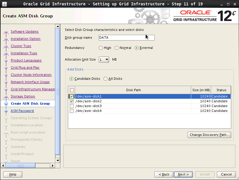 以grid用户创建asm磁盘组,创建的磁盘组为Oracle数据库提供存储。