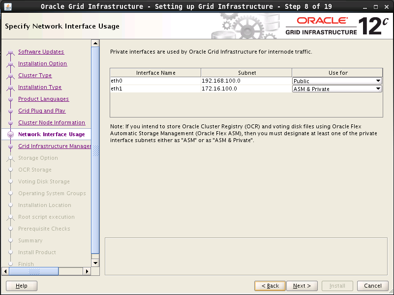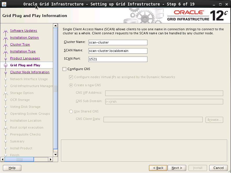 其中scan-cluster IP 并不是主机,只是一个配置了 DNS 域名解析的 IP 地址,作用类似 VIP。在这个例子里面,我们把 Oracle RAC 的域名定为“scan-cluster.localdomain”, 您需要把它替换成适合自己的名字。