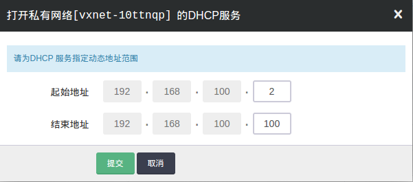 这里推荐修改 DHCP 服务范围为2~100是为了方便配置数据库节点的 VIP, 比如 192.168.100.3对应的 VIP 可以是192.168.100.103。
