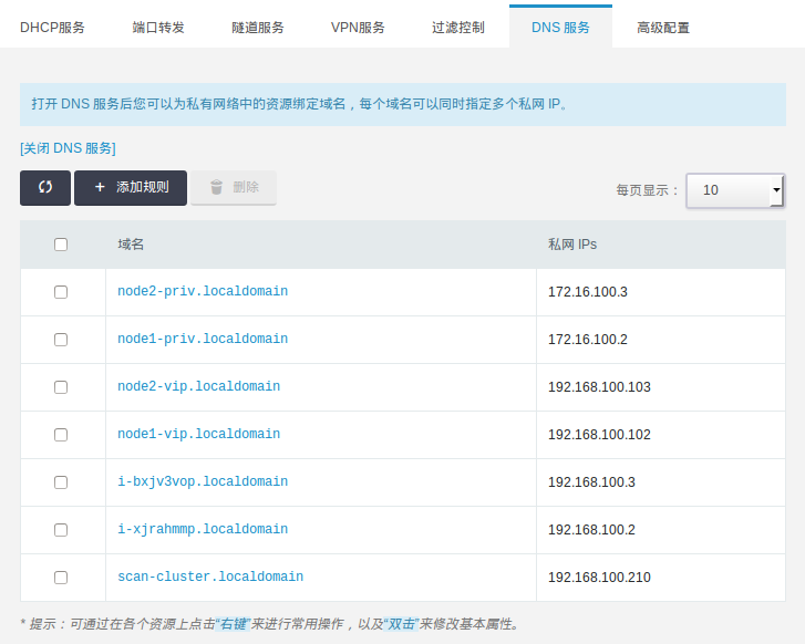 Oracle RAC对外提供的地址是scan-cluster域名,Oracle会管理scan-cluster IP地址,但是要求它能被DNS解析。青云路由器提供了私网DNS功能,可以方便地在私网里面定义DNS记录,用于配置scan-cluster域名。