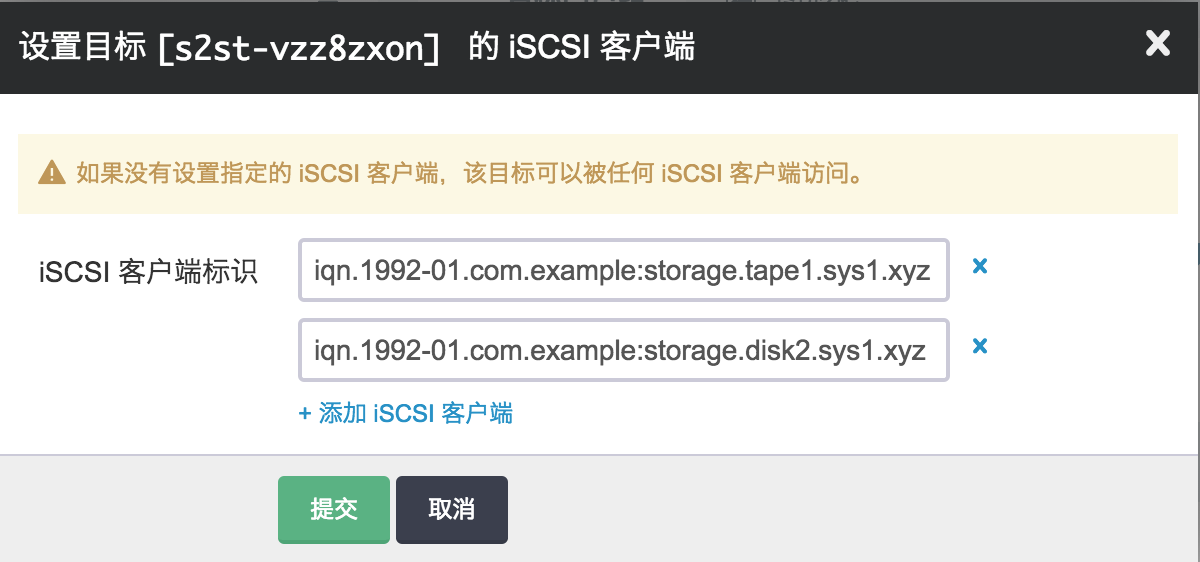 编辑/etc/iscsi/initiatorname.iscsi,加入 InitiatorName。 如果你在配置目标时设置了 iSCSI 客户端的 initiator name,请保证这两个名称一致,否则后面的登录操作会失败。
